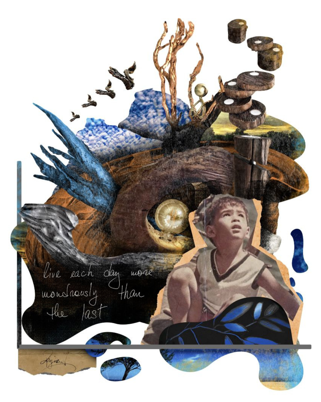 Featuring a collage by Paw Castillo, the artwork highlights Raymond's creative journey as a visual artist and writer on the front, and a quote from one of his poems at the back.